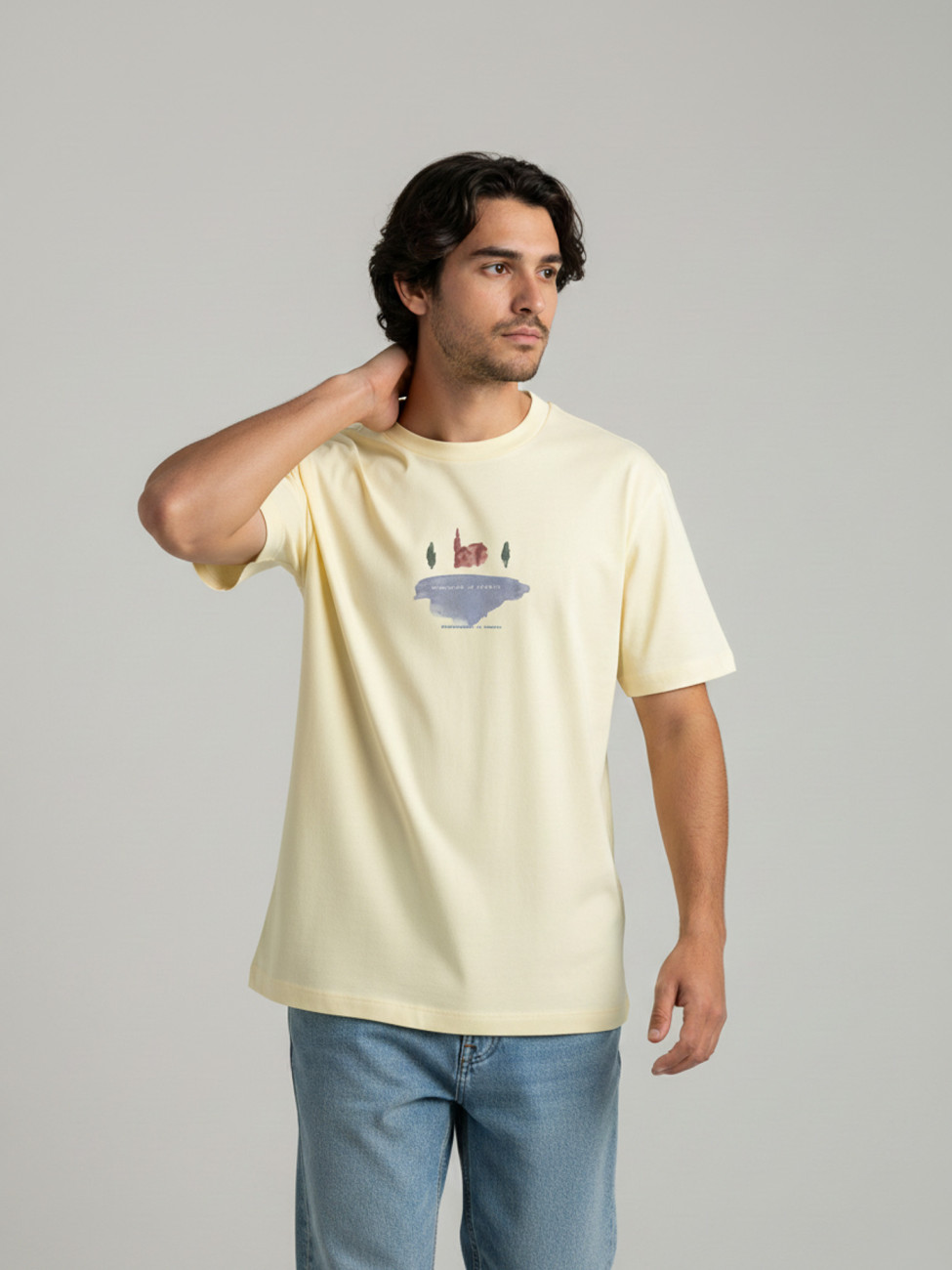 PUIGCERDÀ TEE ret homenatge al Pirineu català amb un delicat dibuix aquarel·la del llac Puigcerdà al pit. El seu disseny oversize i el cotó entrellaçat proporcionen comoditat i suavitat, mentre que el estampat evoca la calma i la llum del paisatge, convertint la camisa en una història d'arrels i territori.