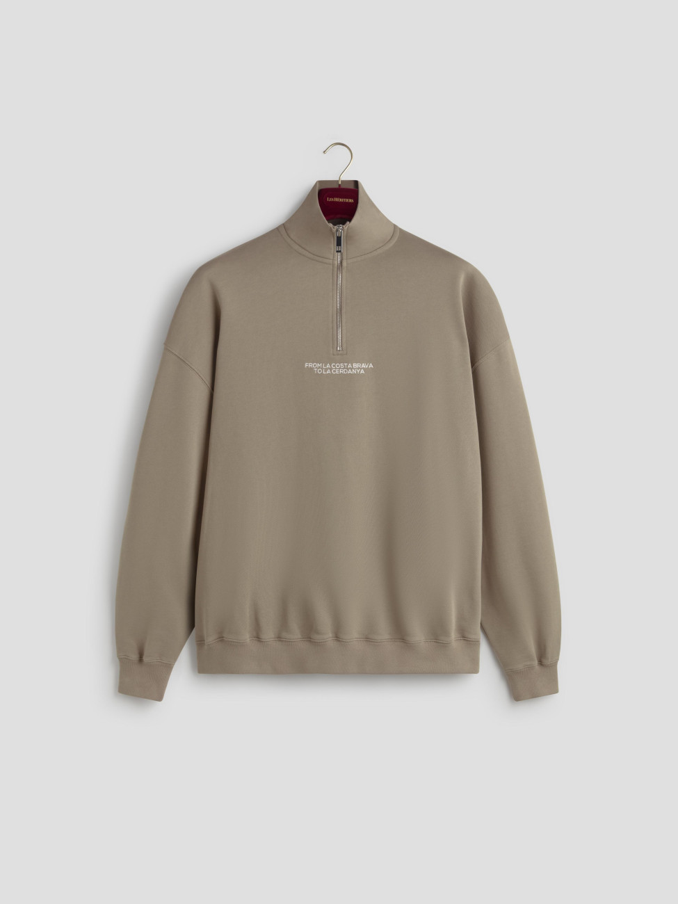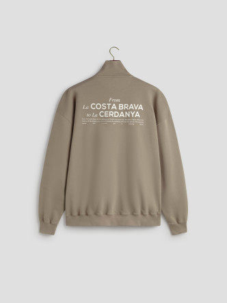 LA COSTA BRAVA A LA CERDANYA, com un viatge constant entre el mar i la muntanya, les arrels i el moviment. Elaborat en cotó 100% de 440 g/m2 sense perca, i amb un tall regular, aquesta peça ofereix estructura, confort i caràcter. La cremallera i el tirador personalitzat amb la H completen una peça dissenyada per explicar la teva història sense parlar. Platja d’Aro.