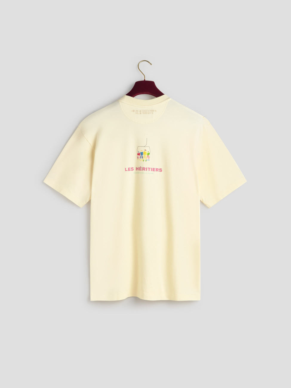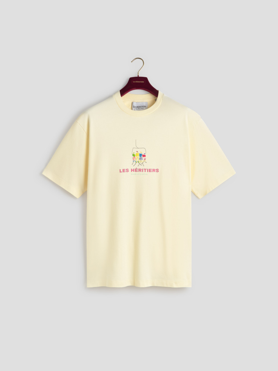 Le SKIER TEE capture une journée parfaite dans la neige avec des illustrations aquarelles d'une famille sur une chaise, symbolisant le mouvement et le lien familial. Son design oversize et son coton doux interlock véhiculent la chaleur et la nostalgie, transformant la chemise en une scène pour ceux qui apprécient la mémoire et le style.