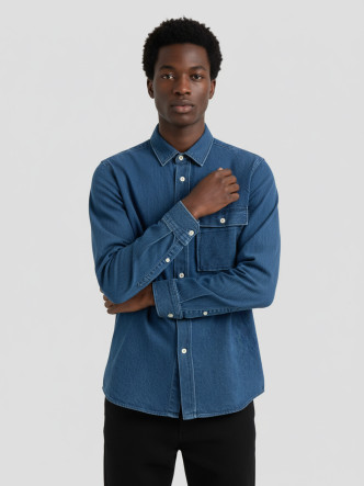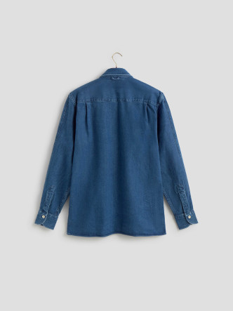 Overlay INDIGO OVERSHIRT in Les Héritiers couleur marine pour homme. Un vêtement polyvalent de l'esprit de travail contemporain, fait dans un mélange doux de coton 58% et TENCEL Lenzing 42%, qui offre une résistance et une chute lisse. Il a coupe régulière, poche avec soufflets dans la poitrine et fermeture avec boutons dans le ton naturel. Idéal comme une couche de temps légère.